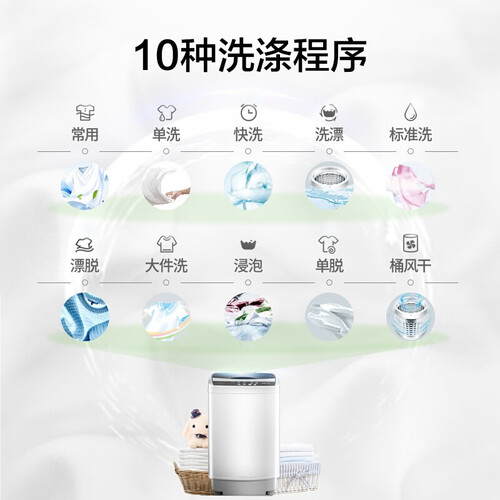5.6kg的精巧机身,占地不足0.26平方米,可轻松摆放于阳台、卫生间等狭小空间。内置10种洗涤程序,轻松实现专业洗护。
