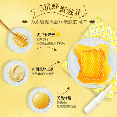 采用食品级成分,温和低敏,给予肌肤更贴心的呵护。其中含有果萃维他命成分,可有效淡化唇部细纹,令双唇更嫩滑。
