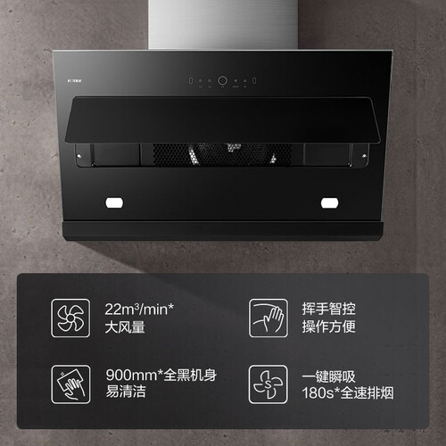 全黑的设计,能够搭配各种装修风格。玻璃钢化玻璃材质,更好打理不粘油污。搭载自主设计电机,飓风风量不留油烟。