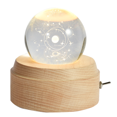 本品既是水晶球也是八音盒,水晶内雕梦幻星空,营造一个晶莹梦幻童话世界。打开开关,旋转灯光可印在墙壁上,富有艺术气息。
