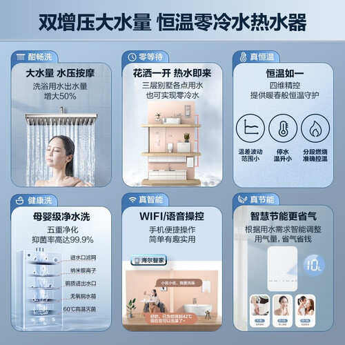 双增压零冷水,兼顾大水量和合适的水温,舒适沐浴一触即发。具有三种不同的零冷水模式,照顾不同用水习惯。