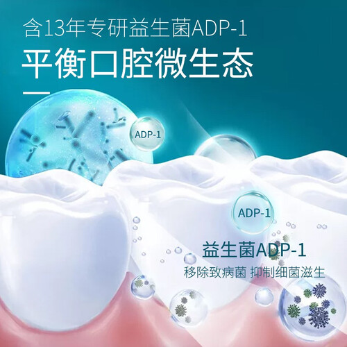 含ADP-1益生菌,帮助平衡口腔菌群,改善口腔生态,强健口腔,从源头预防口腔问题;海洋薄荷香,温和不辣口,持续清新口气。