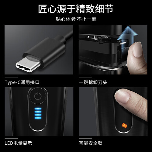 搭载磷酸铁锂电池,续航时间长,降低充电频率。八方向浮动刀头,轻松搞定难剃部位。