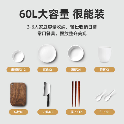 热风内循环,90℃中温杀灭细菌,有效防止外部空气进入二次污染。3-6人家庭容量收纳,轻松收纳日常餐具,摆放整齐美观。