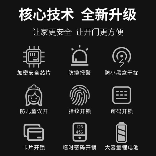 直插式锁芯,隐秘性更好,安全性更高,面板被破坏也不能开锁。半导体指纹传感器,指纹识别速度显著提升,开门快人一步。
