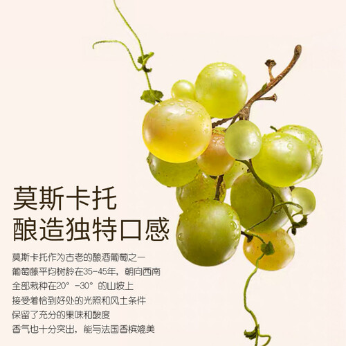 采用了传统酿造工艺,能为葡萄酒带来更多风味,并改善质地和结构。莫斯卡托葡萄藤经过阳光和雨水的灌溉,果味和酸甜味相得益彰。