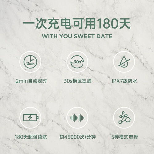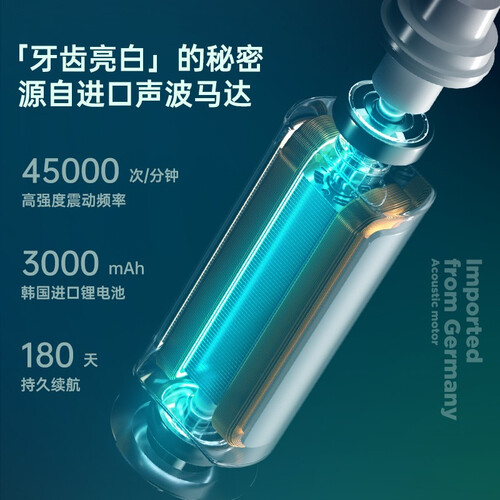 内置德国声波马达,可提供强劲的动力,呵护牙齿的健康。全身使用了IPX7级防水工艺,全身可水洗,严密不进水。
