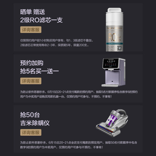 采用天然矿化滤材,可以将原水过滤成纯净水,感受清冽爽口的口感。采用升级大通量设计,可以满足4-5人连续用水。