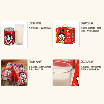 这款旺旺儿童复原乳营养旺仔牛奶,内含多种营养元素,口感香浓顺滑,卡通形象包装,专为儿童设计,宝宝都爱喝。
