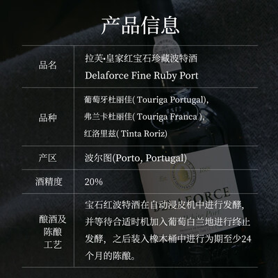 源自葡萄牙皇家酒庄,酿造的甜型波特酒,拥有浓郁的年轻酒体,带有覆盆子和李子的香味。适合搭配经典的甜品,别有一番滋味。