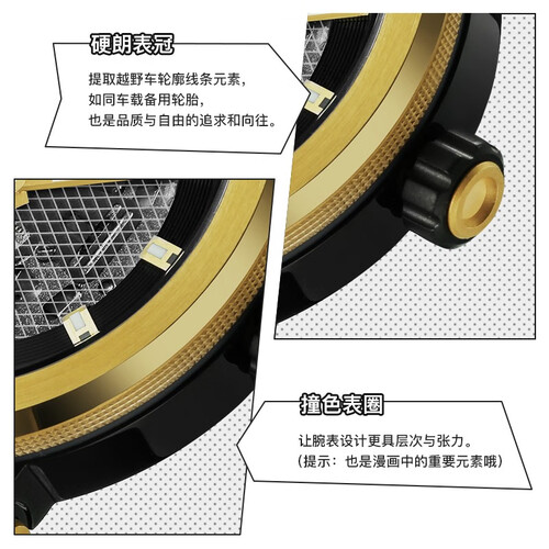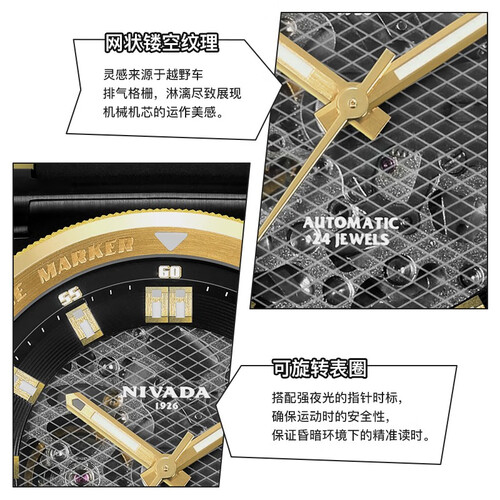 黑与金的撞色表盘设计,富有时尚轻奢质感,佩戴更美观时尚。搭配夜光指针时标,无惧黑暗环境,时间尽在掌握。
