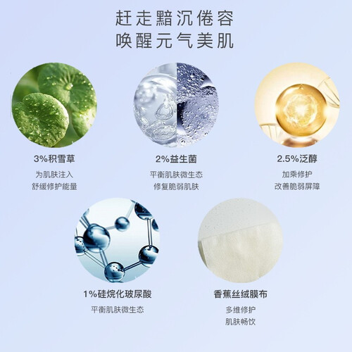 益生菌提取物生成健康的皮脂膜,让肌肤状态更稳定。维生素B5修护肌肤受损屏障,改善皮肤粗糙暗沉。