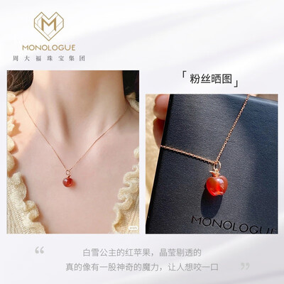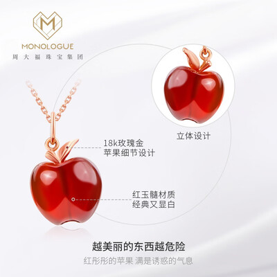 18K玫瑰金材质,可塑性强,硬度高不褪色。吊坠镶嵌红玛瑙苹果造型,可爱灵动,寓意热烈情谊,同时象征平安健康。