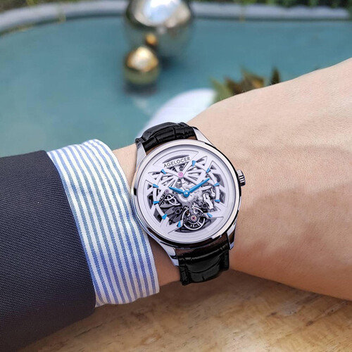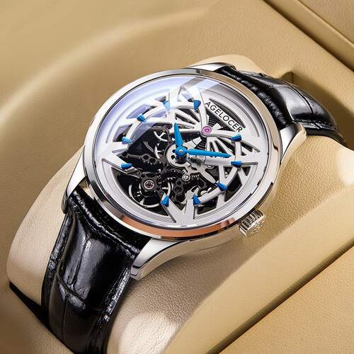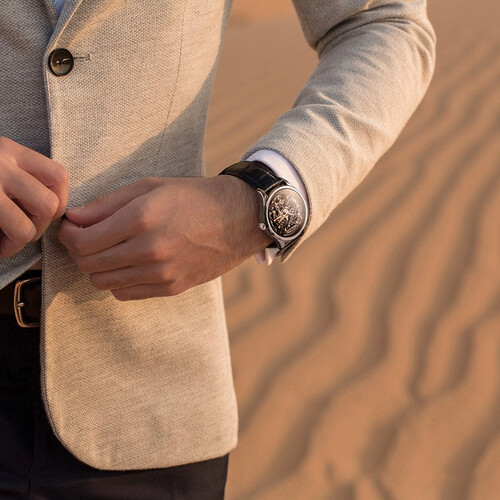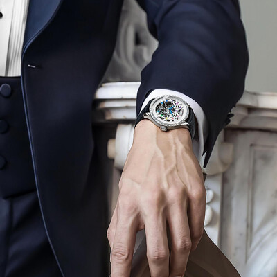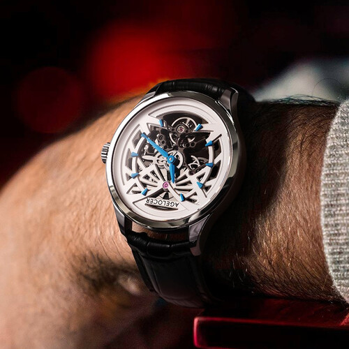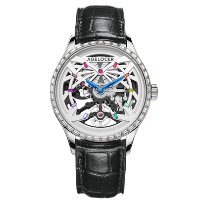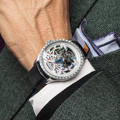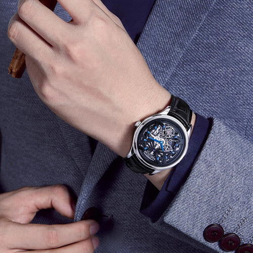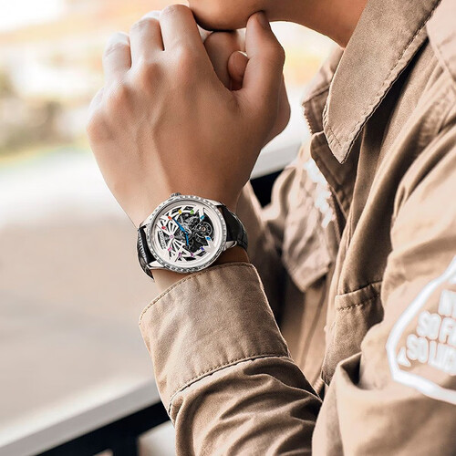 表盘采用全景镂空设计,诠释潮流风尚,尽显艺术美感。罗纹表冠构造,调节时间更加方便。