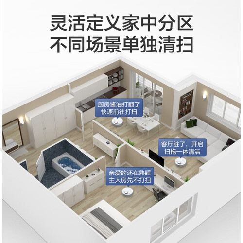 BLDC电机产生澎湃吸力,能吸走地面上的果渣碎屑,光脚走路毫无压力。支持划分清扫区域,能满足不同场景的清扫需求。