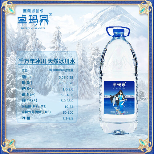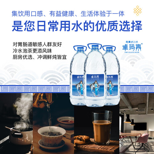精选卓玛泉天然纯净水,其富含人体所需的丰富矿物质元素,冰川好水,喝出健康。口感细腻,具有较小的活性分子,助力身体代谢。