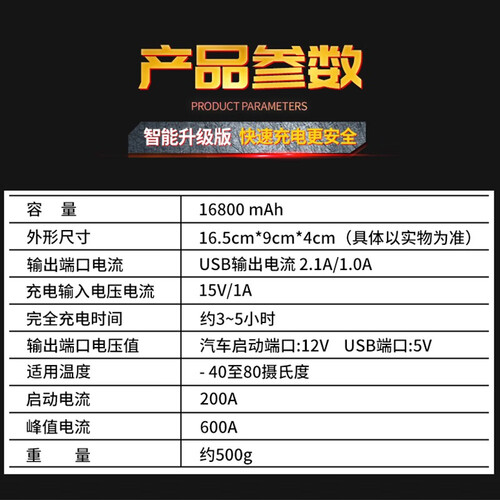 采用聚合物锂电池,可实现大电流输出,稳定耐高温。自带USB接口也可为数码设备充电,使用方便快捷。