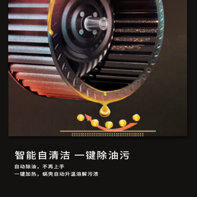 内置智能自清洁功能,一键除油污,日常清洁打理更省心。爆炒大吸力,从容应对各种烹饪环境,打造无烟出风。