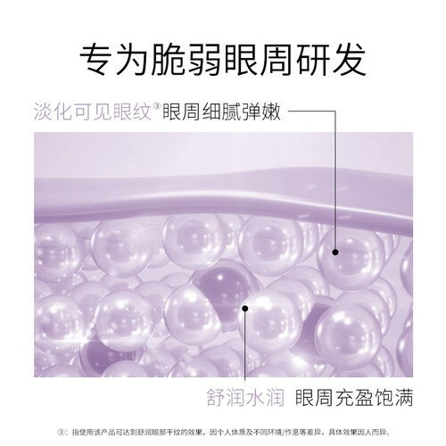搭载紫色微晶黑科技,能够帮助紧致眼周肌肤,提升眼周轮廓。同时加入5D玻尿酸,对抗眼周肌肤干燥,肌肤质感更加细腻水润。