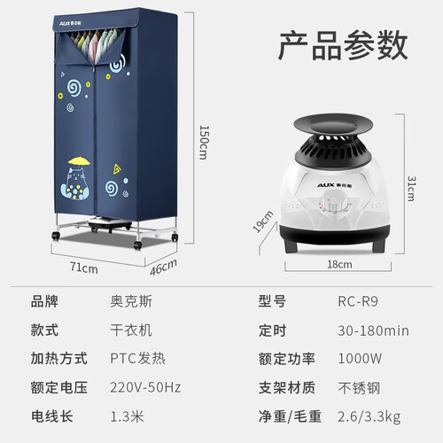 1000w大功率,急速干衣。180分钟定时,360°恒温烘干,呵护衣物更柔顺。16根不锈钢管,强力支撑不变型。