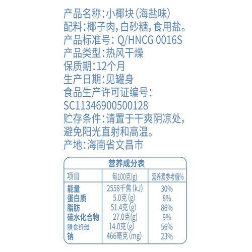采用专研配方,打造细腻绵密的海盐口味,香酥不腻。采用独特的加工工艺,使椰子块表面呈现多个细孔,口感更加绵密松软。