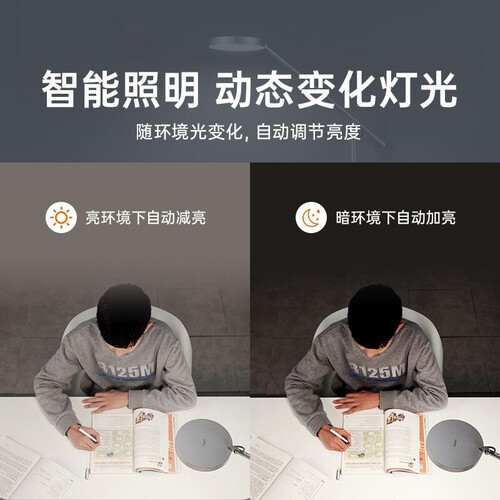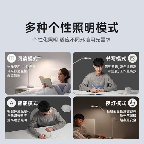 阅读、书写、智能、夜灯四种模式可选,可满足更多个性化照明需要。结合智能照亮调节,根据我们的需要自动调节光亮,使用更省心。