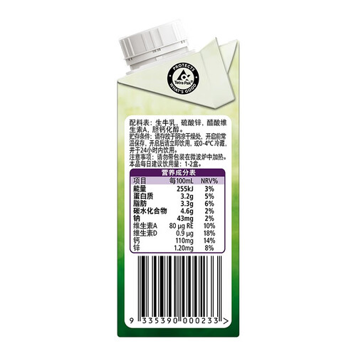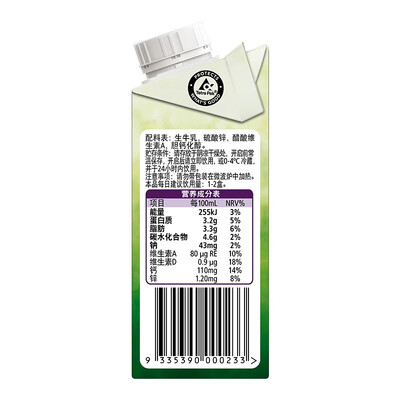 含有钙、锌、维生素A和D等成分,无任何添加剂,天然更健康。同时,口感细腻顺滑,浓郁爽口,每一滴都散发鲜奶的清香。