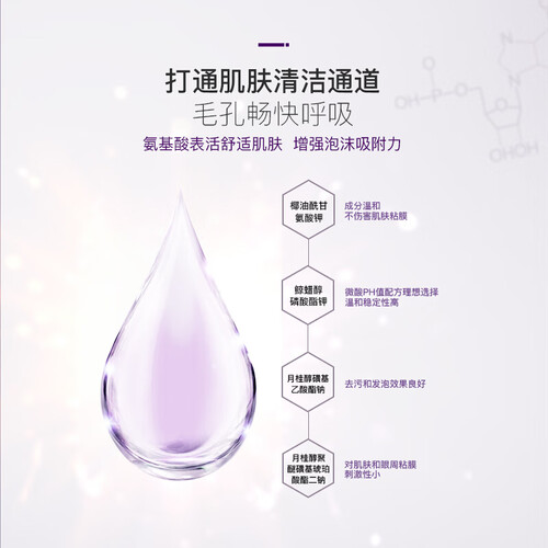 氨酸基洗配方加持苏紫提取物,以可改善暗沉、温和修护,敏感肌优选。淡淡的香味愉悦感官,悦享惬意洁面之旅。