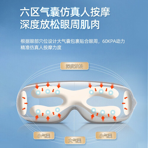 六区气囊仿人按摩,根据眼周穴位用气囊包裹起来,深度释放眼周压力。蓝牙连接功能,通过手机蓝牙连接,能够边听音乐边享受按摩。