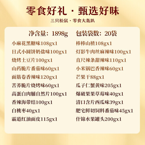 超有料的巨型零食礼包,一次享尽更多美味,告别选择恐惧症。酸甜咸辣、口感丰富,好吃不油腻,满足不同喜好。
