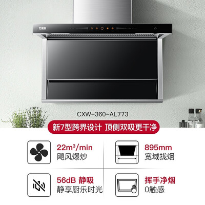 采用新7型结构设计,通过欧式、侧吸结合,能强劲吸走油烟,由瞬时变频增速技术支持,风量达到22m³/min,能快速排烟。