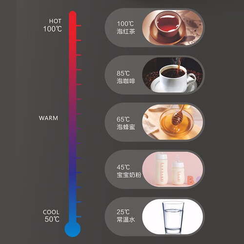 支持四挡水量调节,选定即可自动取水,水满即停,取水期间不在饮水机旁也不怕水满溢出。五挡常用水温,一键便捷取水。