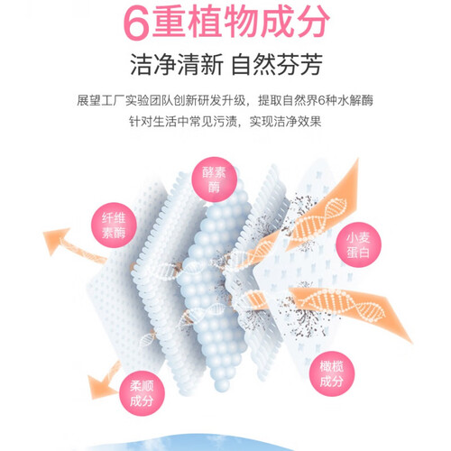 富含6种植物精粹成分,针对生活中的常见污渍,天然有效去污。专门融入酵素精华,深入纤维KO顽固物质,容易漂洗。
