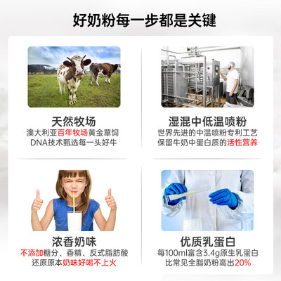 澳洲天然牧场养殖的奶牛,优越的环境造就了更健康的奶牛,奶源更自然纯净,且无人工添加剂,提高妈妈自护力。