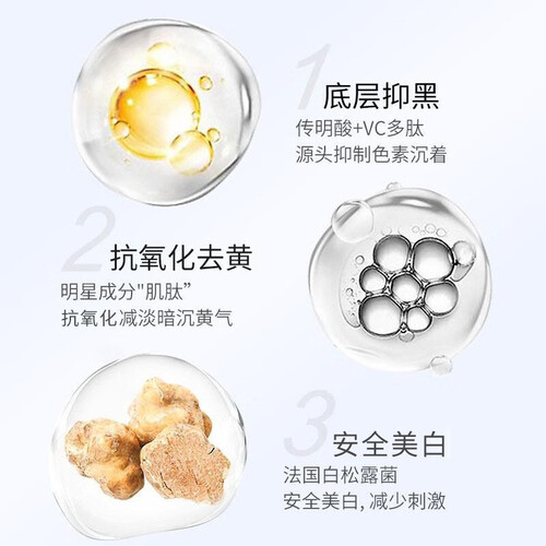 添加99%高纯烟酰胺成分,缓解肌肤暗沉,帮助肌肤恢复白嫩。添加法国白松露菌成分,帮助肌肤维持平稳状态。