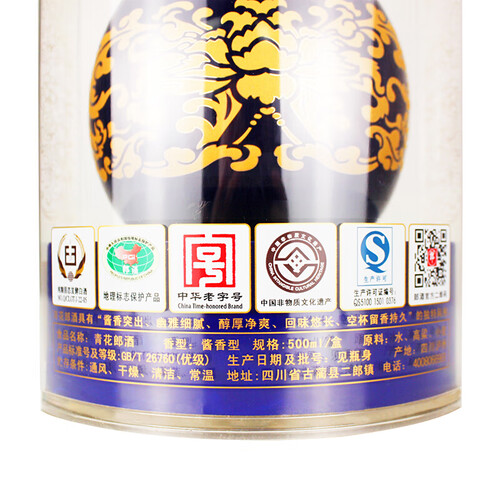 秉承千年古法酿造工艺,工艺虽繁却不删不减,让您品味优雅芬芳。瓶身线条圆润柔和,烤金图案与宝蓝釉色相得益彰,尽显大气。