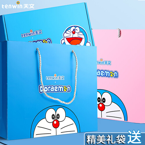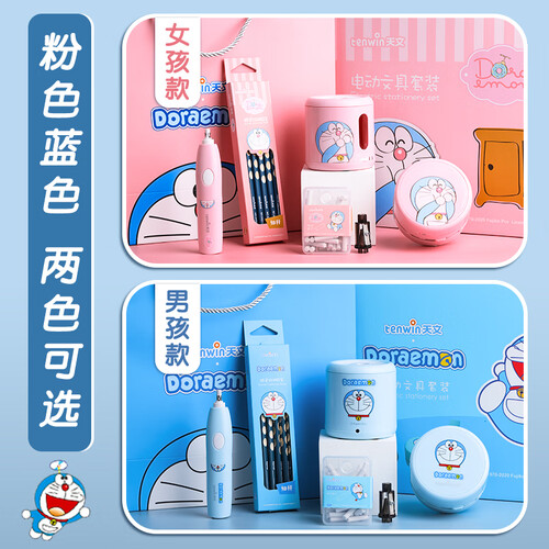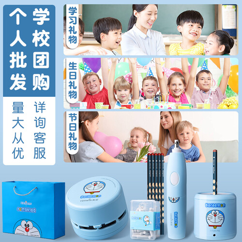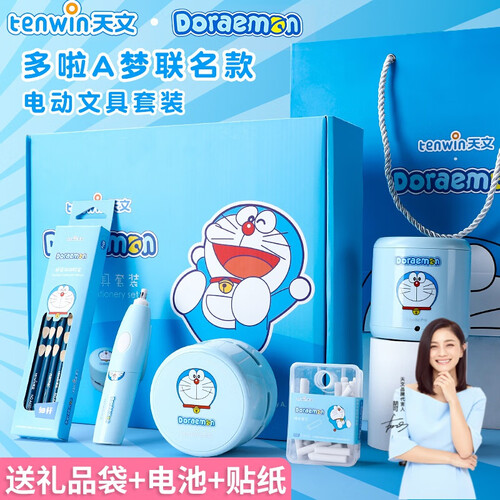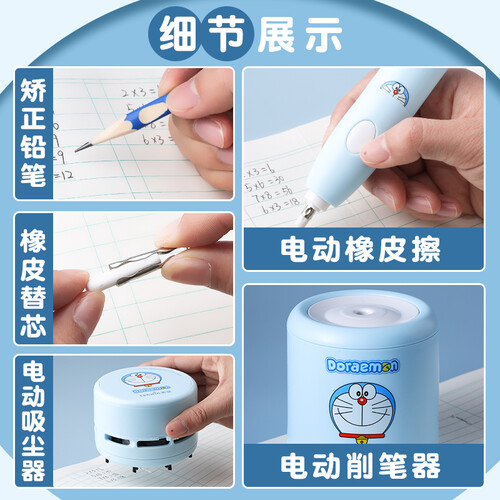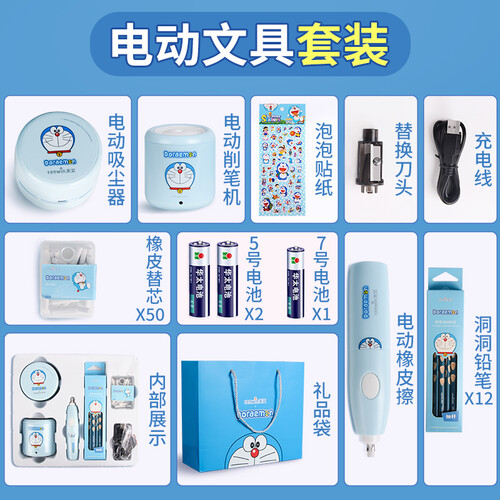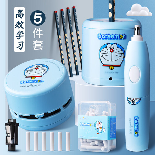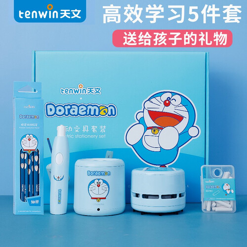 这是送给孩子六一节的5件套文具,囊括了自动转笔刀、铅笔等,蓝胖子哆啦A梦联名款,吸引孩子们的眼光。