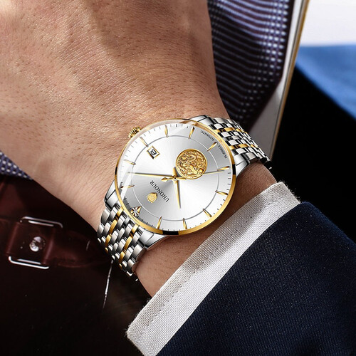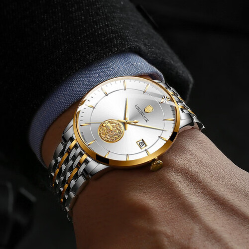 盘龙金币装饰盘面,与间金表带相结合,彰显华丽轻奢的魅力风格,50米生活防水,无惧雨淋,日常洗手也不用摘。