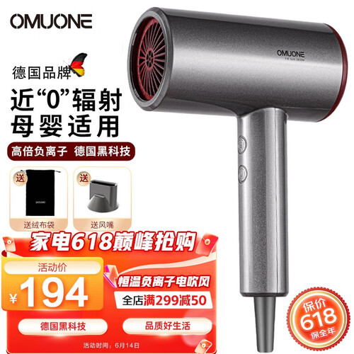 出风口的辐射值降低为0.1μt,接近0辐射,时刻守护家人的护发健康。选用全新优质电机,高达1800W功率快速干发。