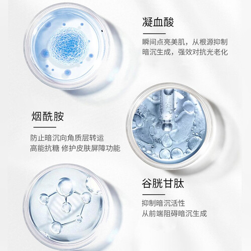 内含凝血酸成分,具有良好的焕亮效果,帮助击退各种面部瑕疵。添加烟酰胺+谷胱甘肽成分,让肌肤白里透光。