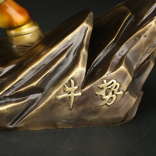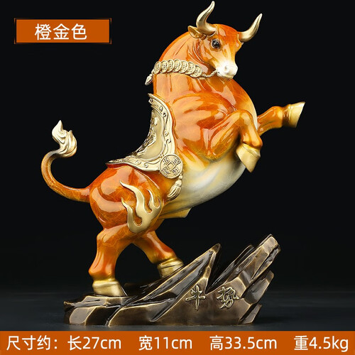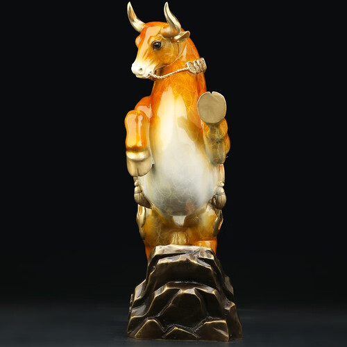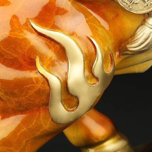 腾气的牛造型,具有扭转乾坤之意,寓意事业红红火火,牛气冲天。融合了火焰、铜钱等元素,丰富整体造型感。