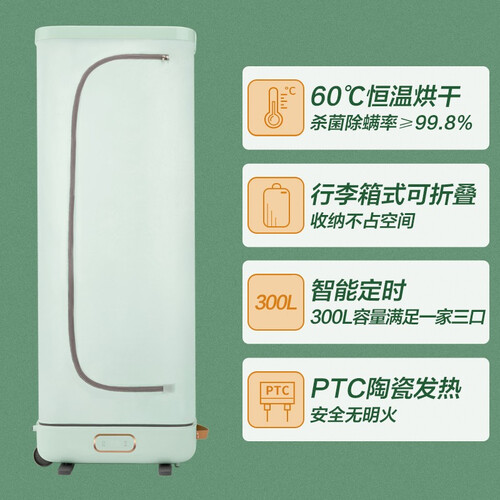 可折叠的设计,让干衣机在不使用期间,能够折叠收纳,不占空间。拥有60℃的杀菌效果,除螨效果更加出色。