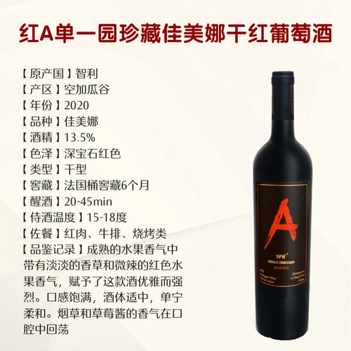 精选佳美娜优质葡萄品种,造就口感细腻美酒。13.5%酒精含量,更适合女生和初学者饮用。