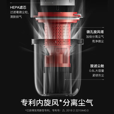 专利内旋风分离尘气,沉淀灰尘颗粒,再进HEPA滤网净化,排出清新的空气。无线手持设计,摆脱电线限制,方便自由清洁整屋。