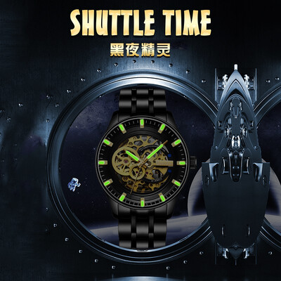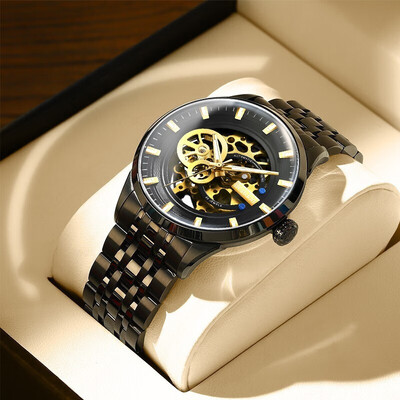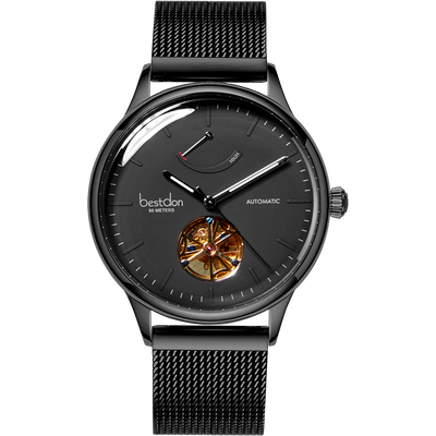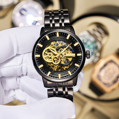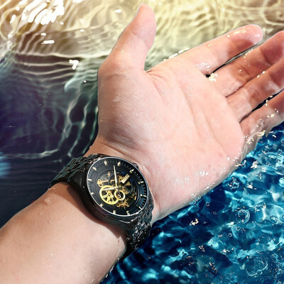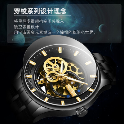 采用交错的镂空雕花盘面,能清晰看到机芯运作,在视觉感官上非常吸引人。搭配黑色的小牛皮表带,浑然一体,佩戴有型有范。
