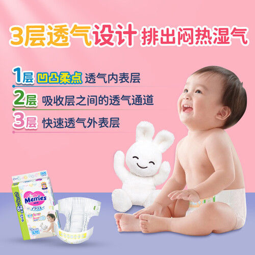 日本原装进口的花王纸尿裤采用3层凹凸柔点透气设计,在温柔呵护宝宝娇嫩肌肤的同时,持续排出闷热湿气。
