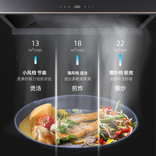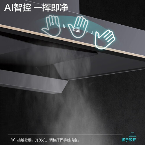 通过使用AI智能感应技术,挥手就能感应,方便家中老人使用。内置立体环吸,360度吸净油烟,吸的更干净。