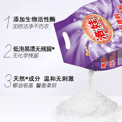内含天然植萃成分,以及椰子油精华,深层清洁云柔呵护衣物。此外,生物酶配方,温和无刺激,低泡易漂洗不伤手无残留。