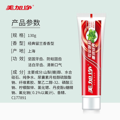 添加硅磨料成分,能够有助减少软垢,清洁牙齿减少牙垢。采用经典留兰香口味,有助于清爽口感,清新口气。