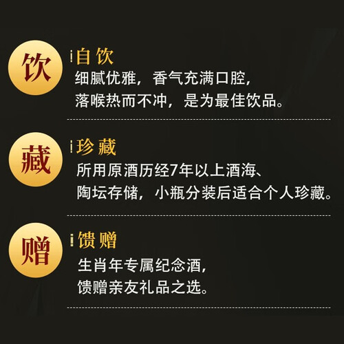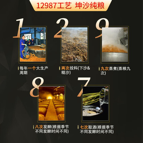 采用四高、五盘、六充、七储工艺制作,酒体老熟自然,丰满醇厚,酱香突出。一瓶一码设计,无重复标码,便于购买者查询。